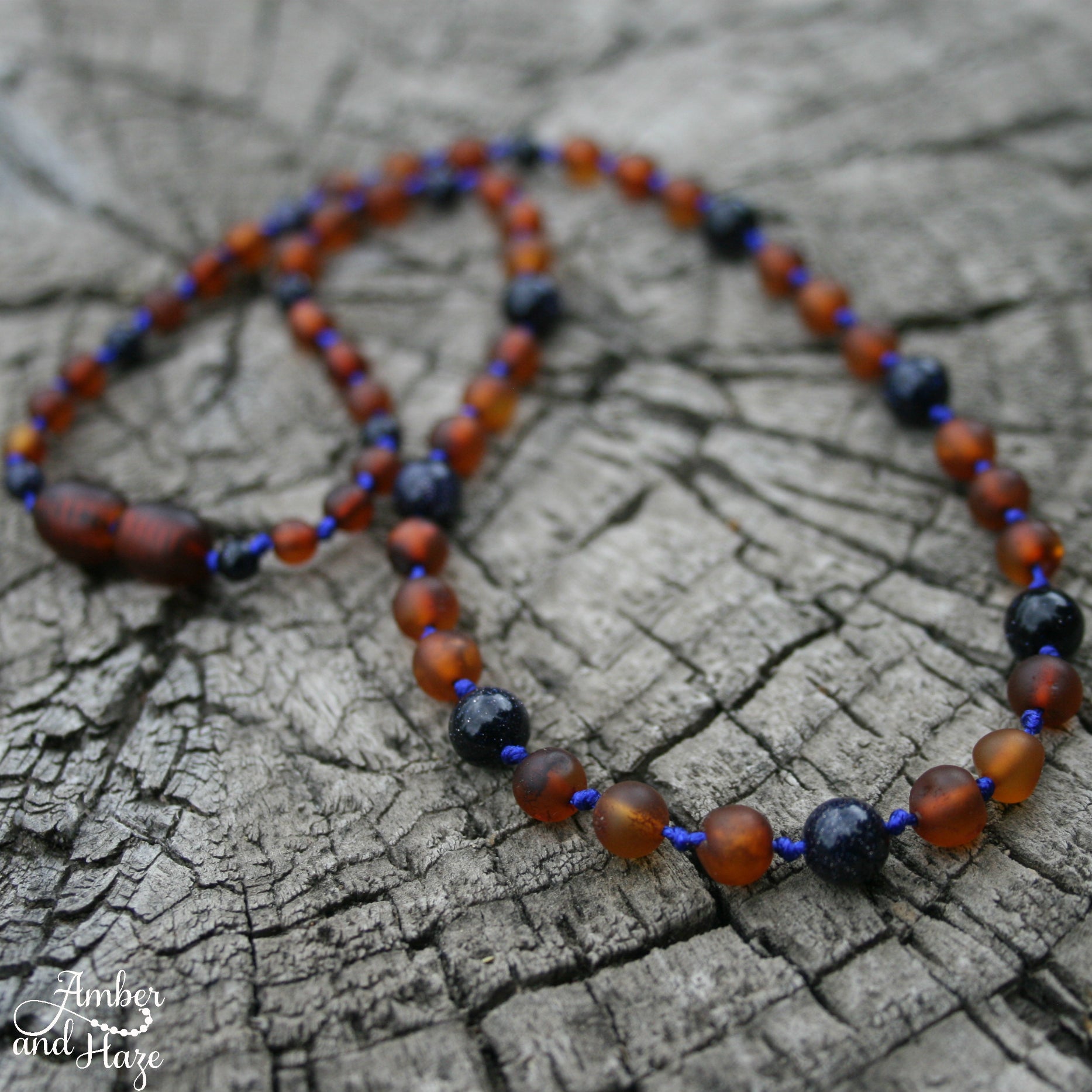 This is a one of a kind 16" necklace strung on royal blue cord with a screw clasp. It has unpolished cognac colored amber and shimmering bluestone beads.