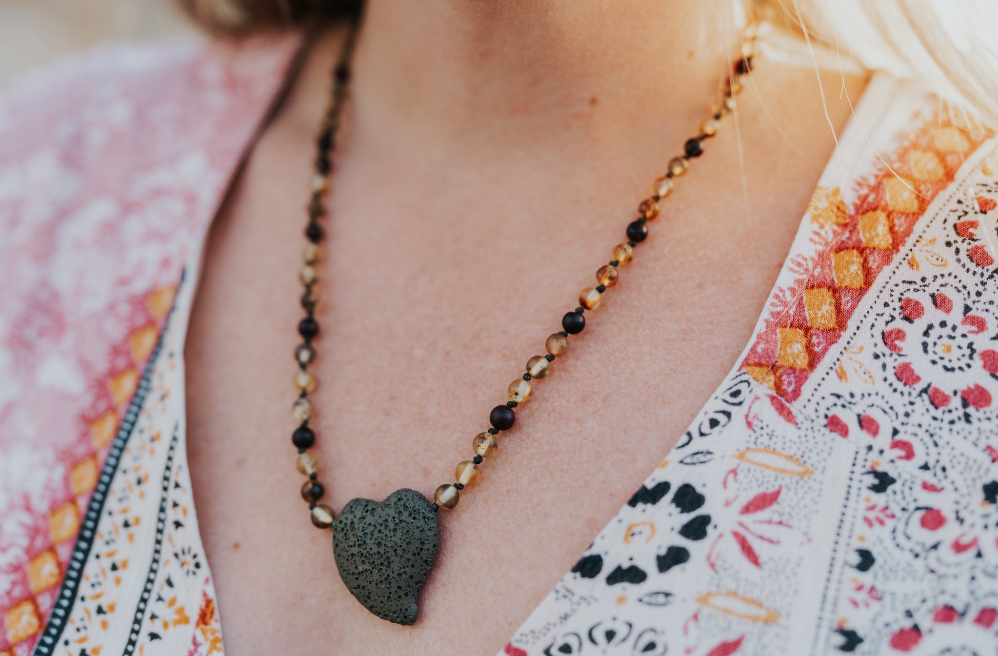 Green Leaf Lavastone Pendant with Unpolished Green and Coffee Amber 22"