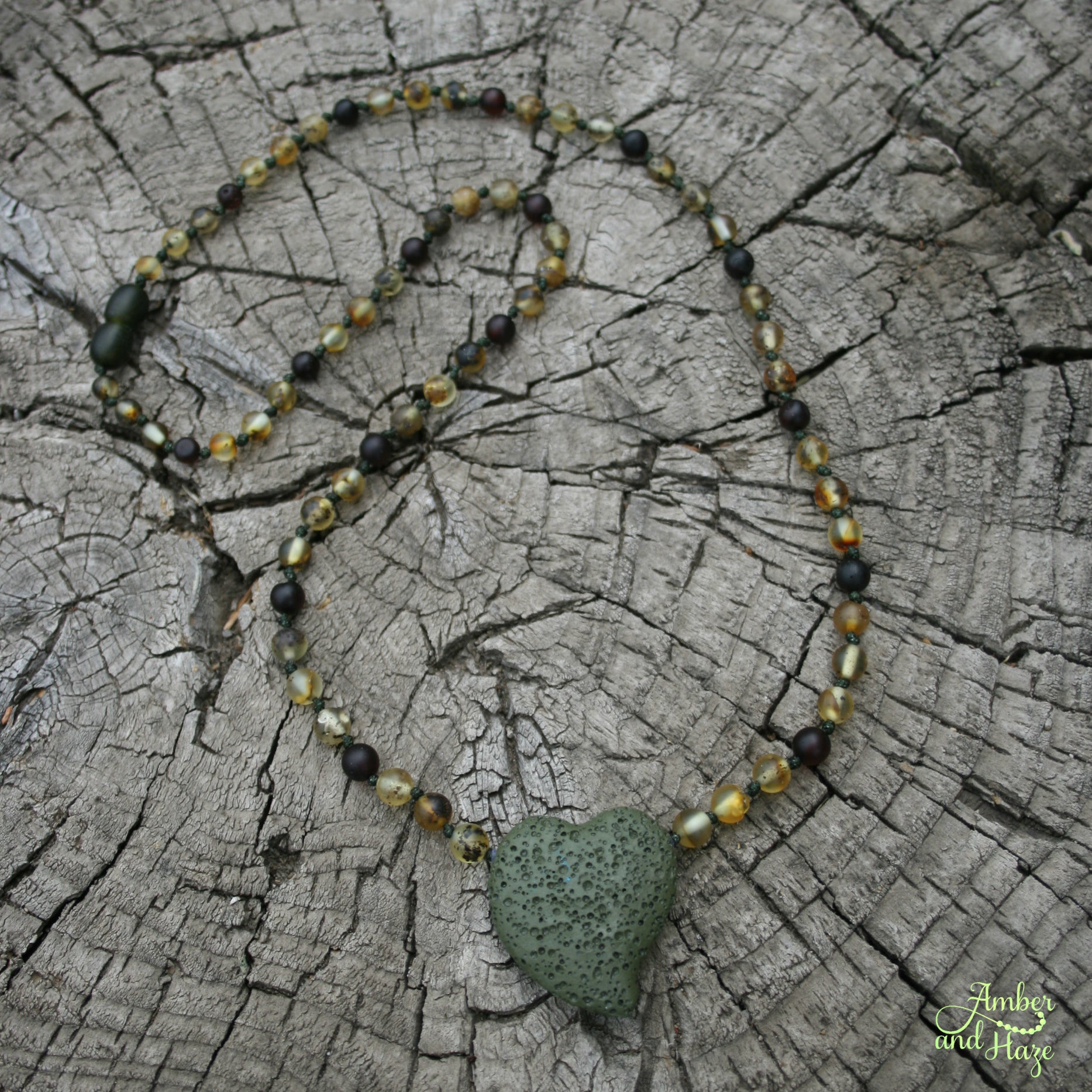 This 22" necklace is a one of a kind piece made with a green leaf shaped lavastone pendant, great for adding essential oils to! The rest of the necklace is made with raw green Baltic Amber and coffee colored amber accents. Everything is strung on dark green cord and finished with a screw clasp.