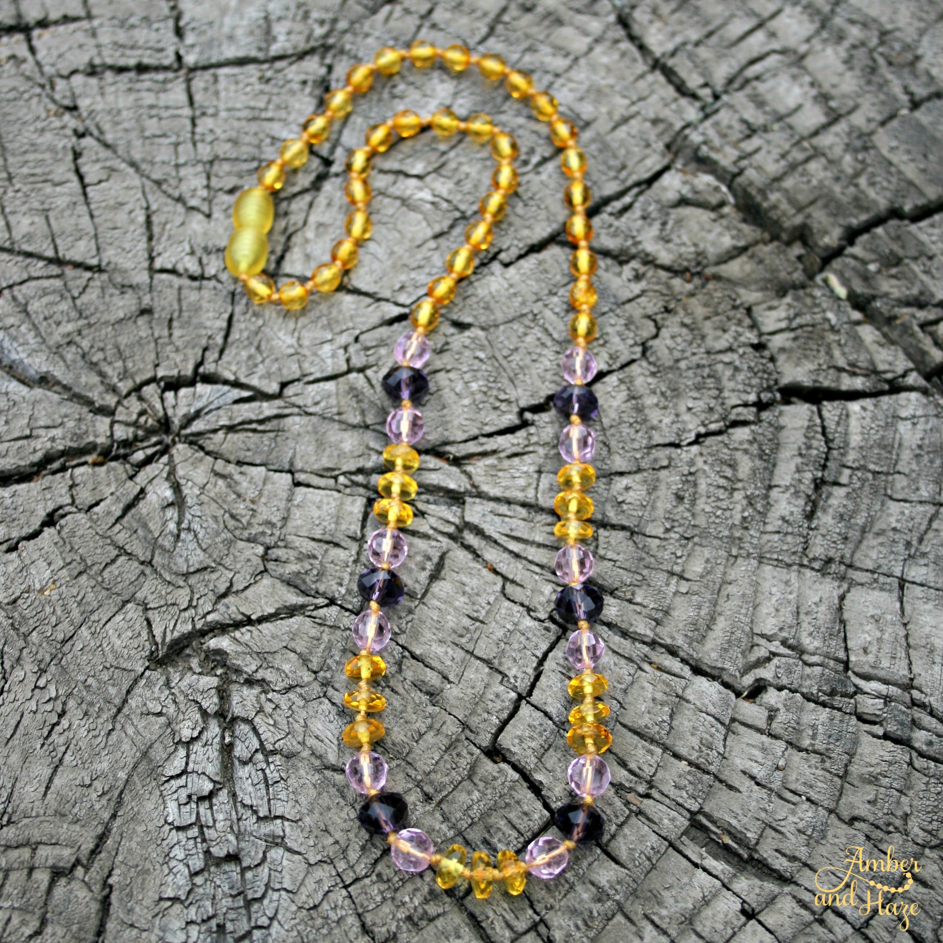 This 18" necklace is a one of a kind piece made with faceted lemon colored Baltic Amber and pink and purple Czech glass beads. Everything is strung on a matching yellow cord and finished with a screw clasp.