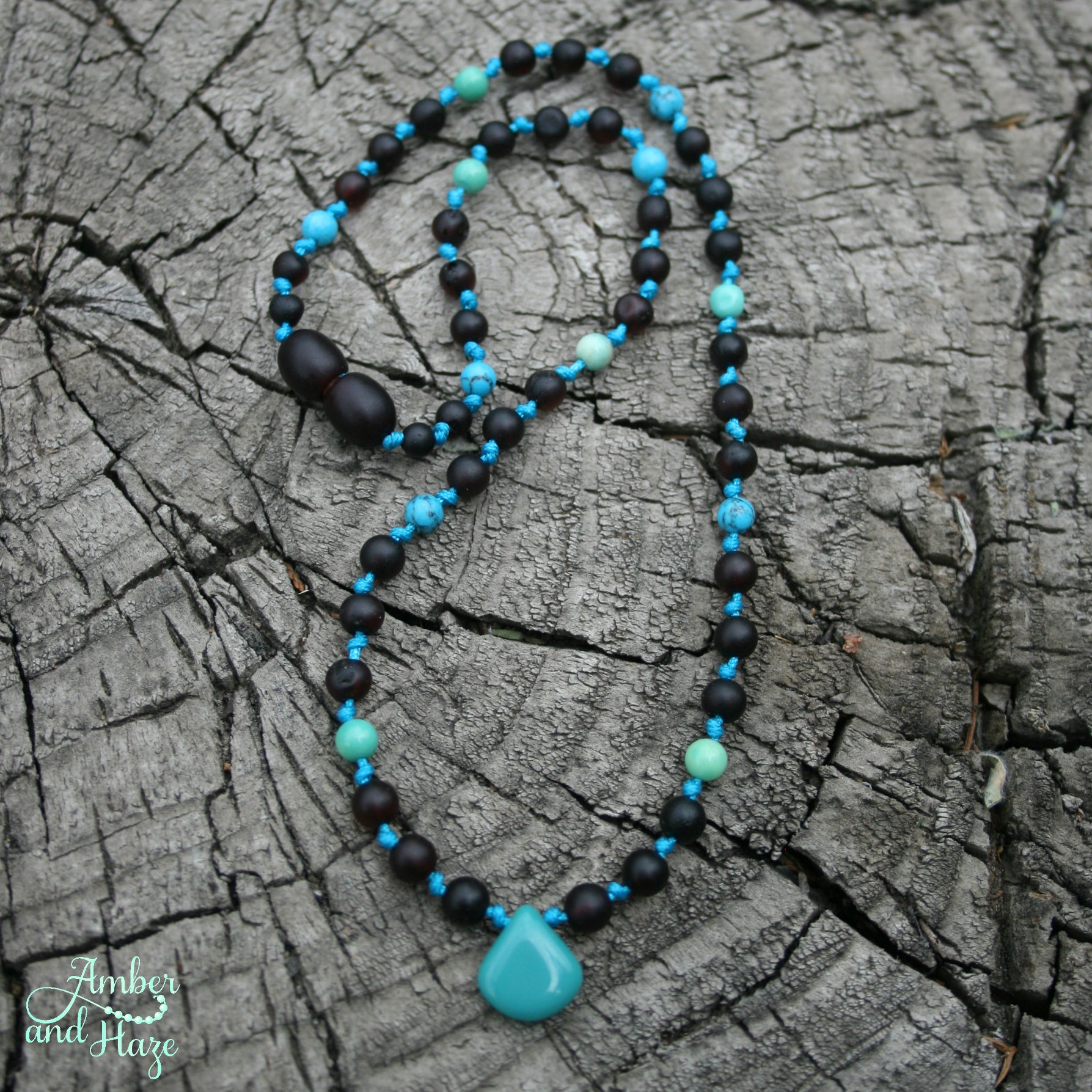 This 15" necklace is a one of a kind piece with a turquoise colored Czech glass pendant, unpolished coffee colored Baltic amber, turquoise and chrysoprase beads. It is 15" with a screw clasp.