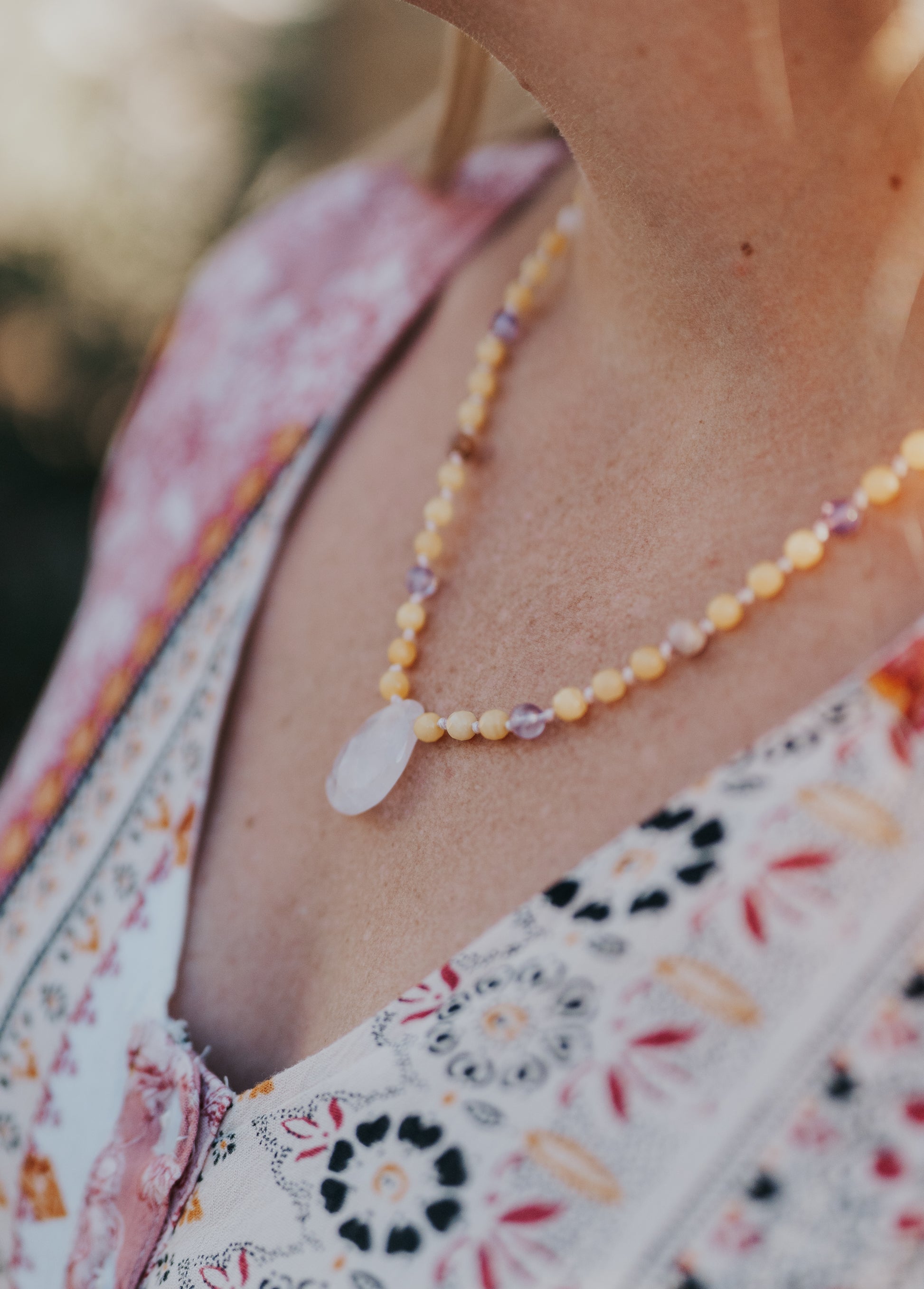 Rose Quartz Pendant with Faceted Milky Colored Baltic Amber and Super Calming Stones 20"