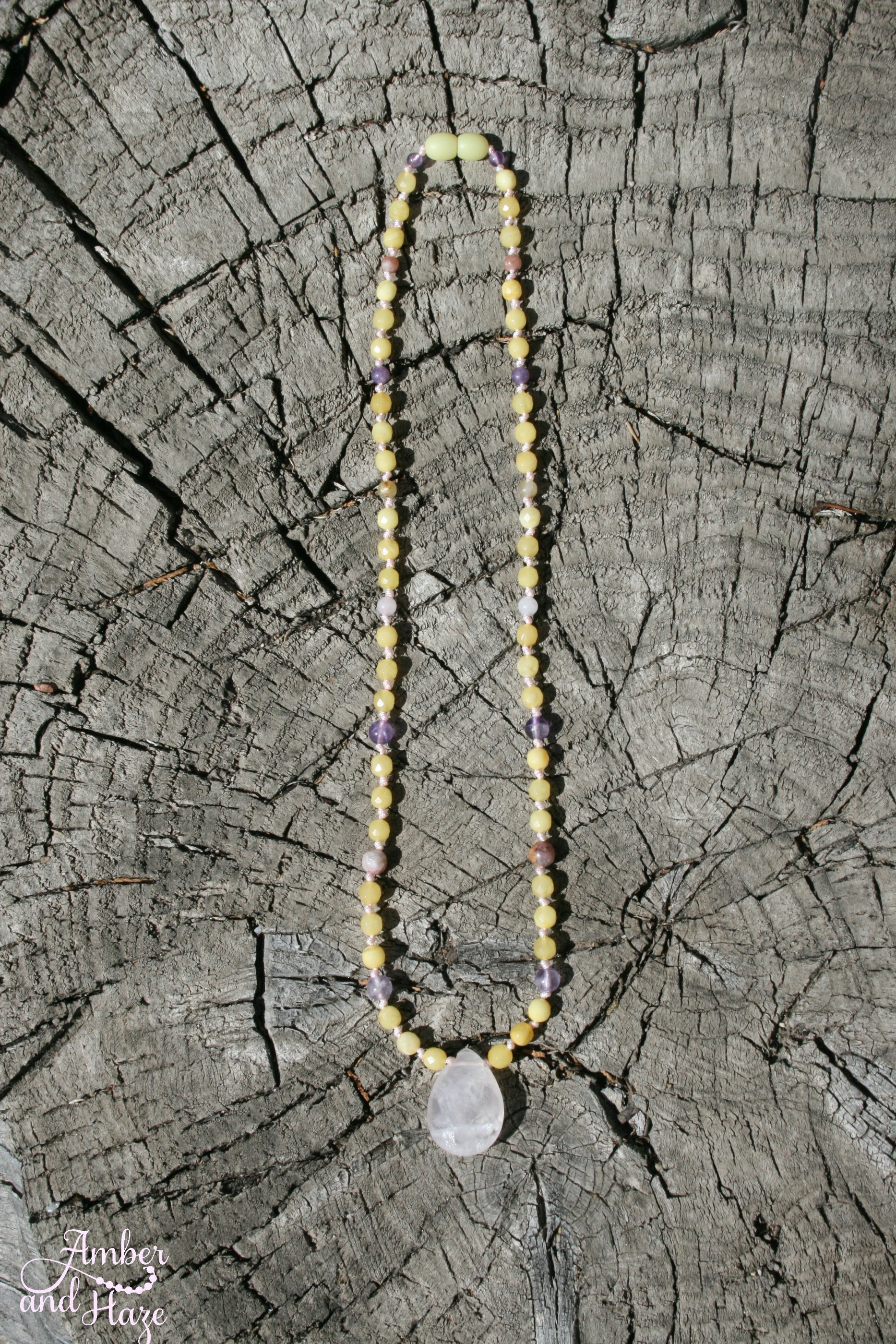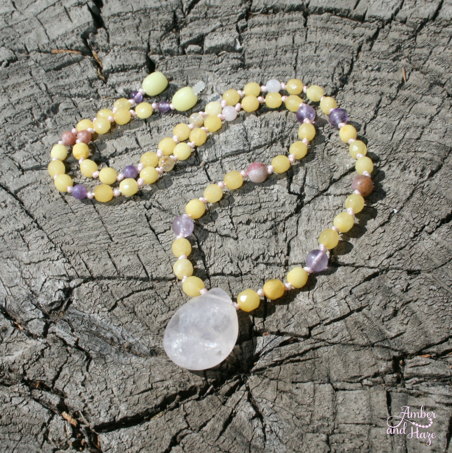 This 20" necklace is a beautiful one of a kind piece with a large faceted rose quartz pendant and raw, faceted milky colored amber. It is made the the super calming girl style that has pink and purple lepidolite, amethyst, rose quartz, pink tourmaline, and rutilated quartz. It is strung on ivory colored cord and finished with a screw clasp.