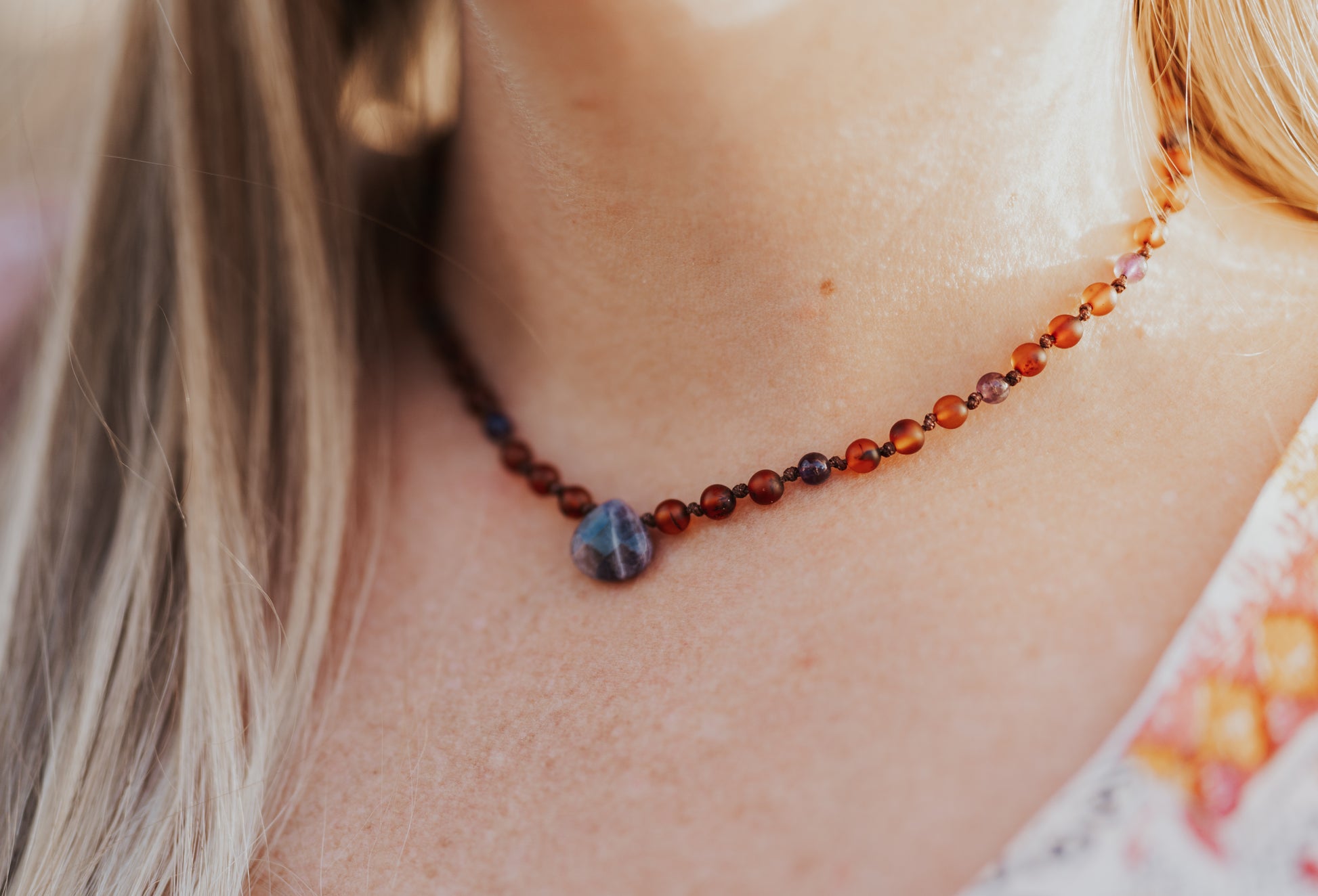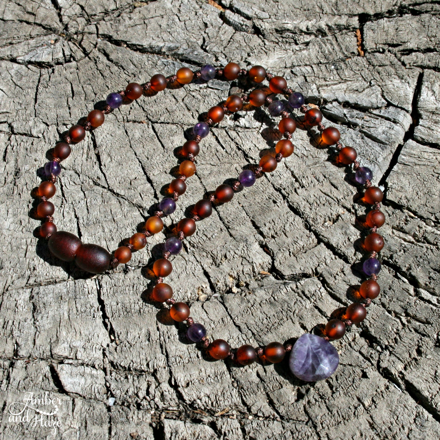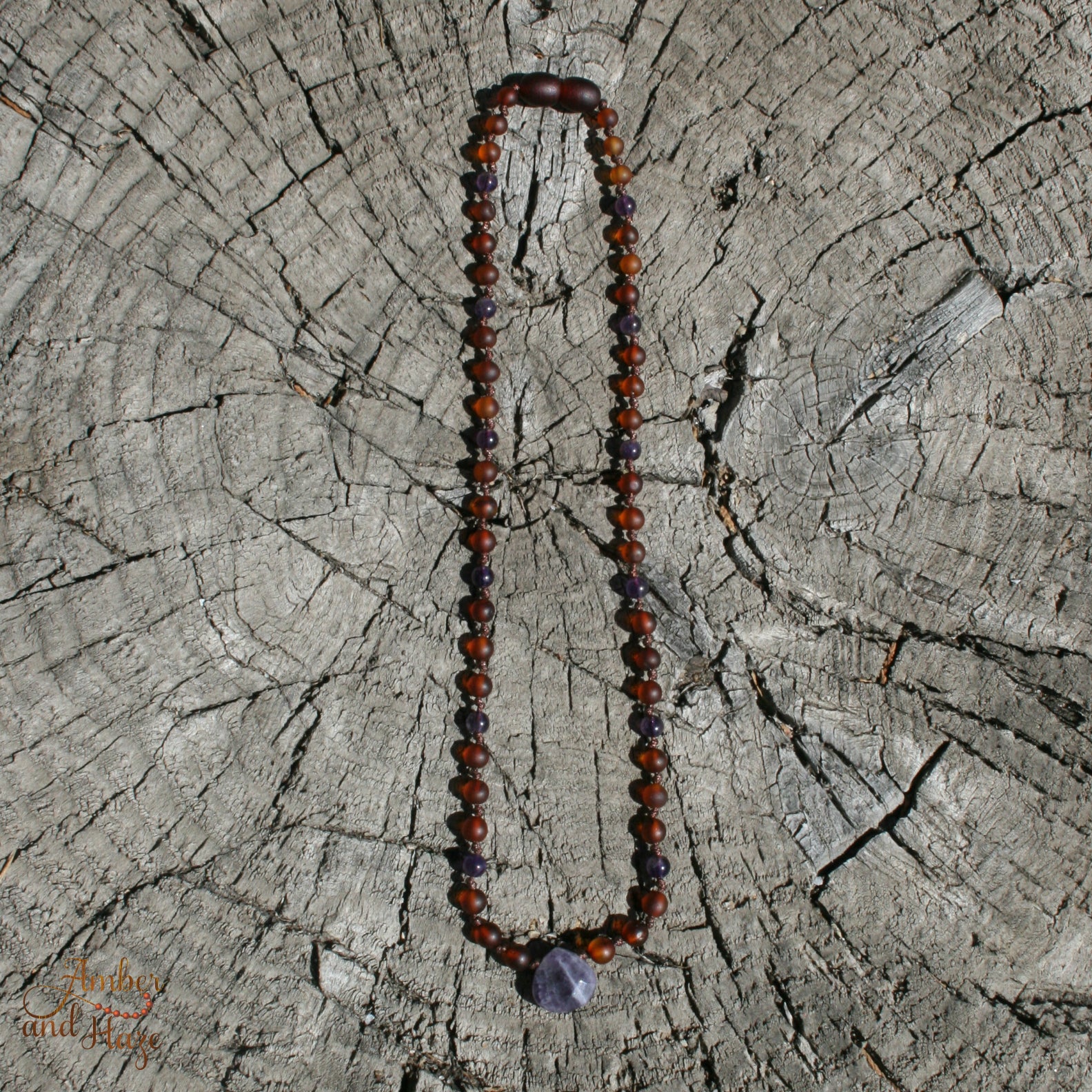 Amethyst Pendant with Cognac Colored Baltic Amber Beads 15"