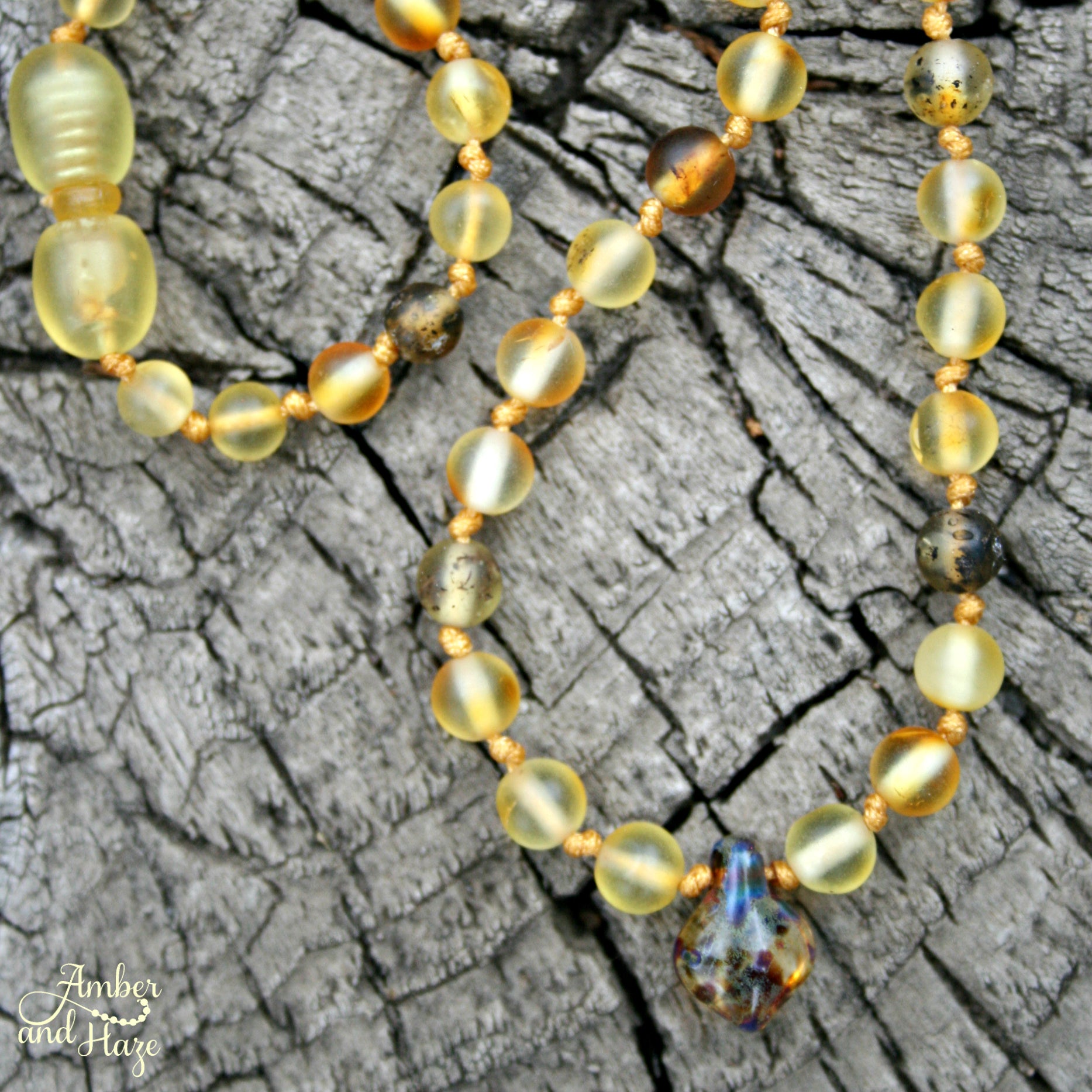 This necklace is a one of a kind piece made with a tiny czech glass pendant and lemon and green colored Baltic amber beads. It is 13" long and has a safety tension clasp.