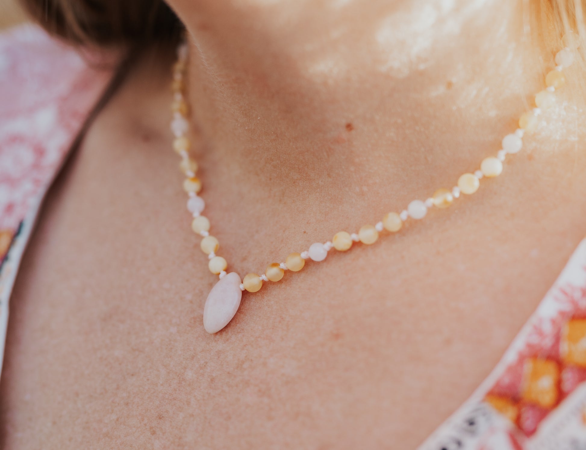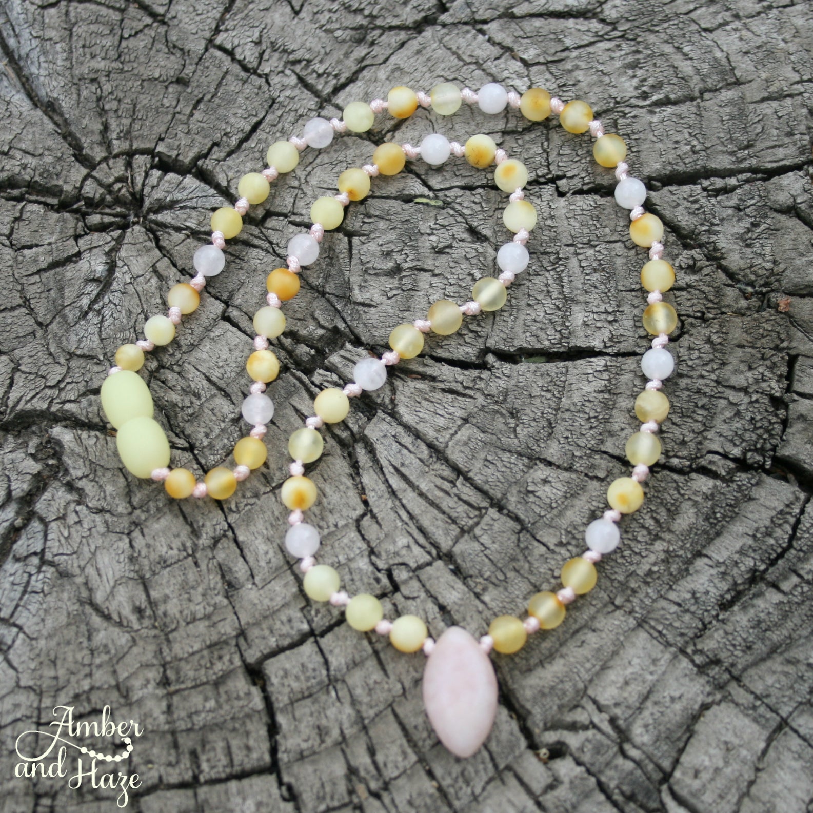 Lepidolite Pendant with Milky Colored Baltic Amber Beads and Rose Quartz 16"