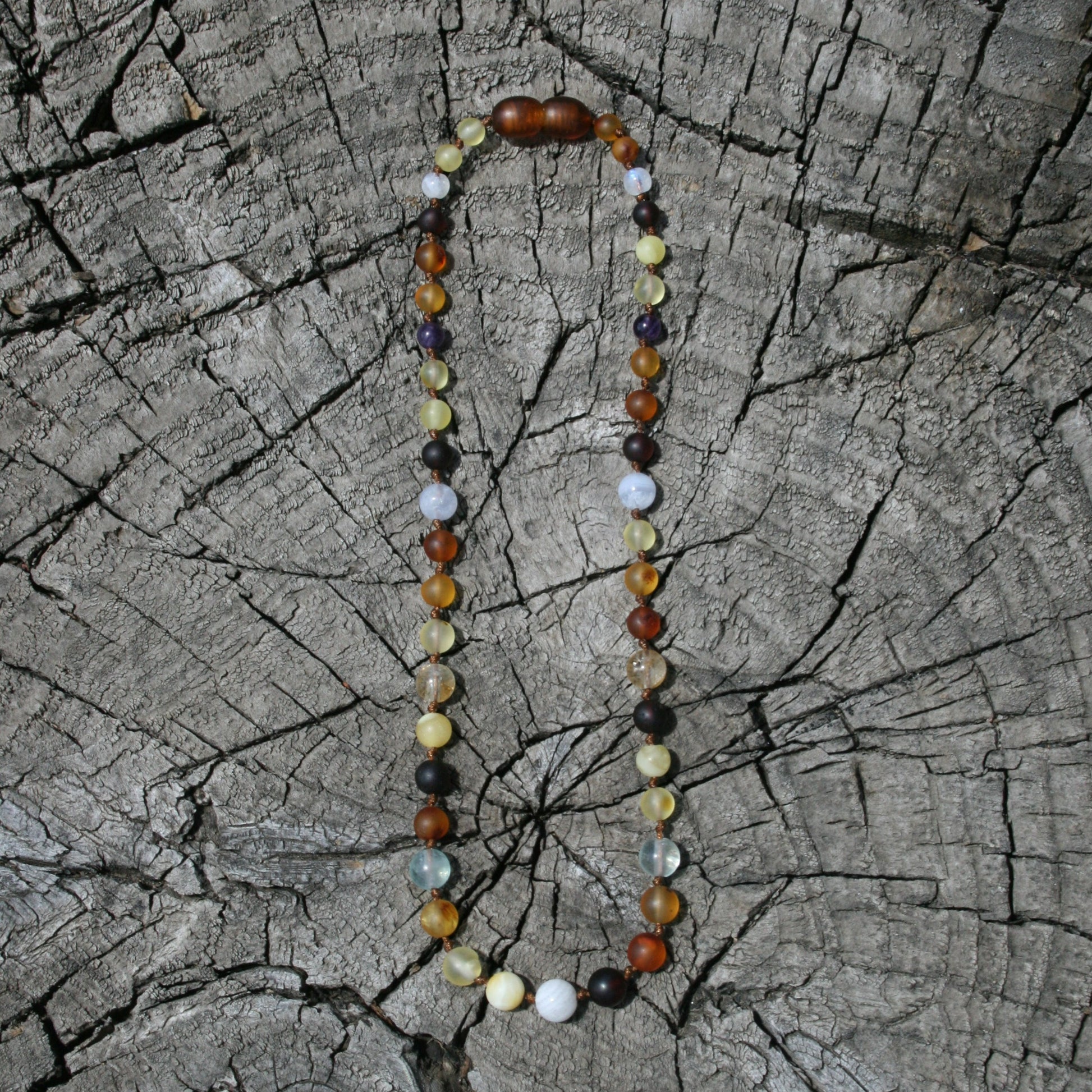 This style is good for colic and pain. It includes multicolored Baltic amber and these stones: moonstone, blue fluorite, amethyst, rutilated quartz, and blue lace agate.