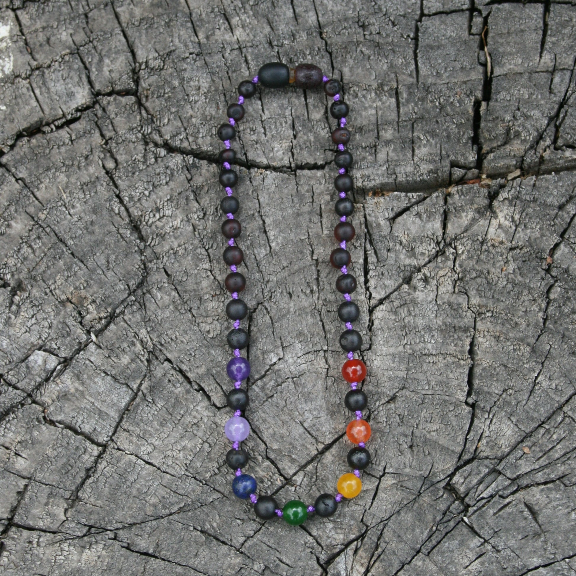 This style is made with coffee colored Baltic amber and these stones: amethyst, carnelian, lapis, & green, yellow, pale purple, and orange jades.