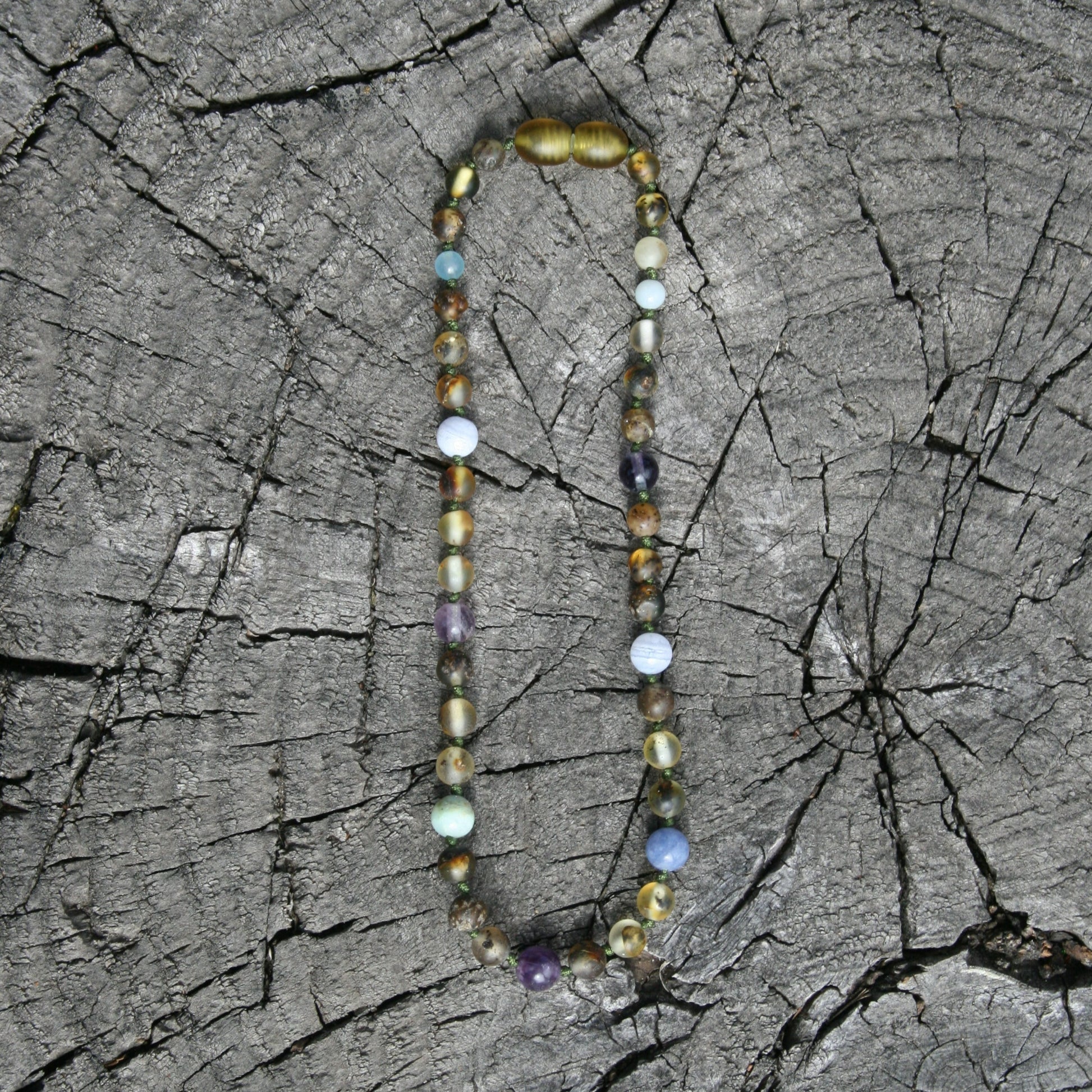 This style is good for ear health and pain. It has green Baltic Amber and these stones: aquamarine, blue fluorite, amethyst, amozonite, and blue lace agate.