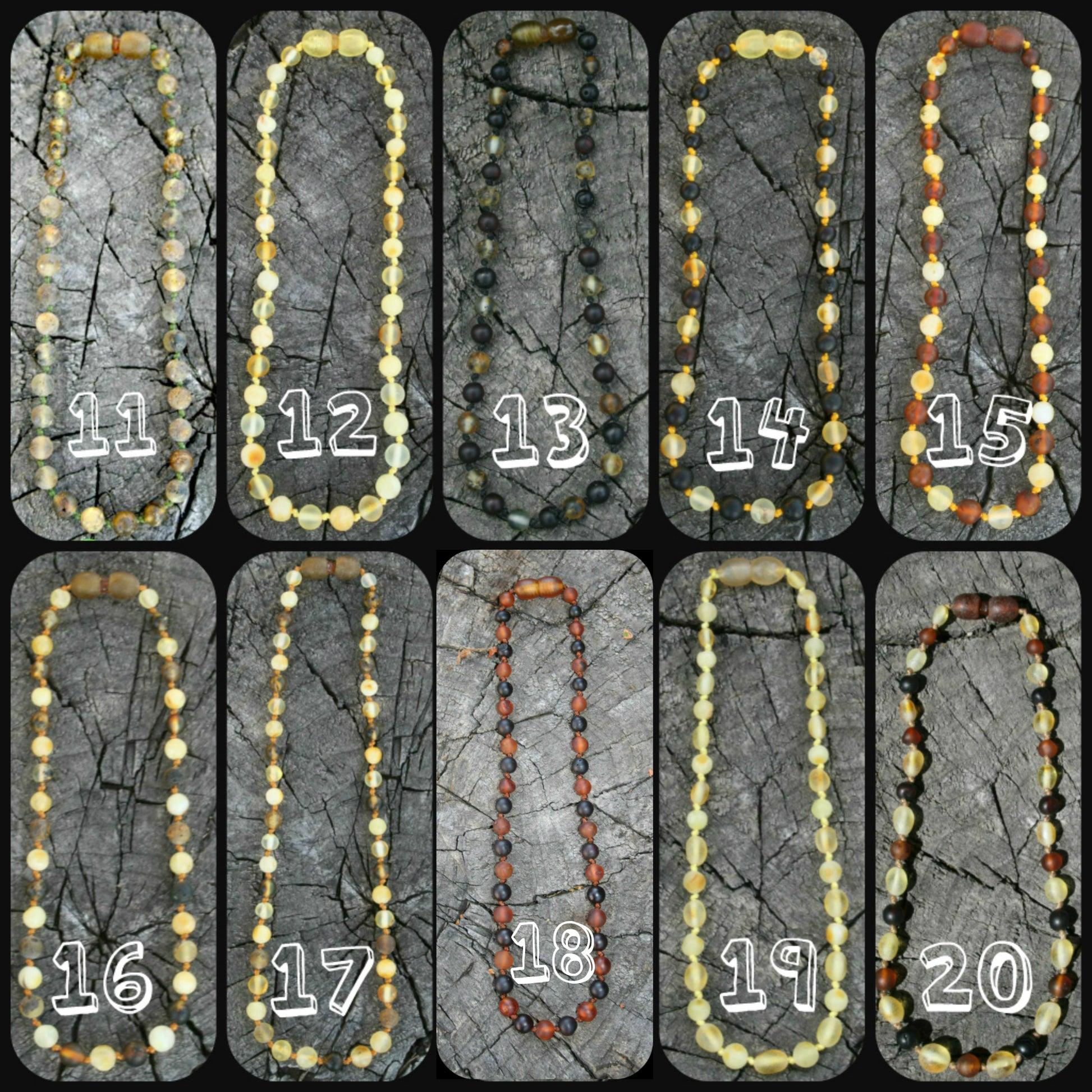 The first picture is with hazelwood and cognac colored amber. The second picture is on hazelwood and milky colored amber. The third picture is of hazelwood, honey colored amber, and reflux stones. You can choose how many beads you want between the hazelwood. Everything is made to order so you can choose whatever color(s) of amber that you want and any stones that you may need! I love to "prescribe" stones for ailments. Message me and let me help you to pick the best ones for what you need!